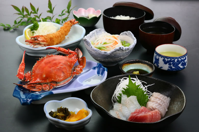ワタリガニ、海老、サザエ、アワビなど豊浜漁港で水揚げされた旬の地魚を、